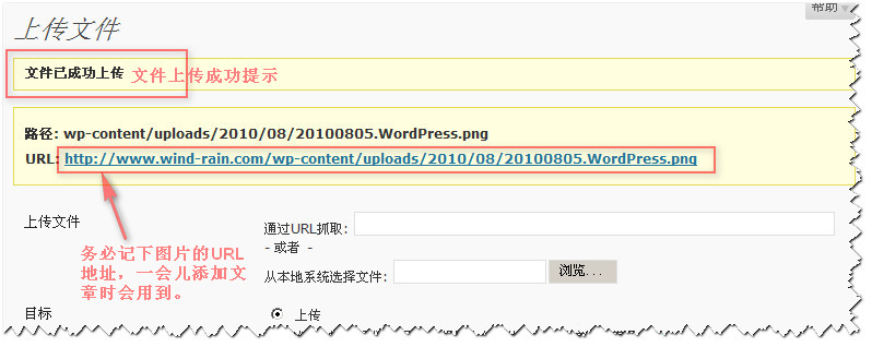 推荐的上传图片方法为使用菜单“工具”→“上传文件”功能,使用方法很简单,即进入该功能后,选择“从本地系统选择文件”,点击“浏览...”按钮,从本地选中图片。其他选项(“目标”、“选项”)默认即可,最后选择“上传”,系统会将选中的图片上传至默认文件夹(wp-content/uploads 目录)中,同时提示“文件已成功上传”,并显示出文件的路径,此时需要务必记录该路径,因为一会儿添加文章时需要使用。